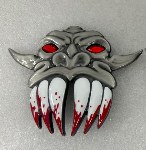 This Demon belt buckle is the Demon on Gene Simmons's boots from 1977 that are now fairly infamous. There are only 100 (they're numbered on the back) of these made and we've got about a handful of these. They measure approx. 4" x 3" x .25" This is just the belt buckle, you'll have to supply the belt yourself.